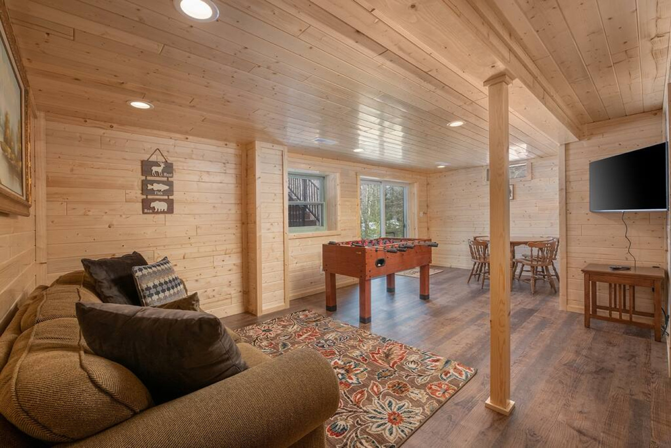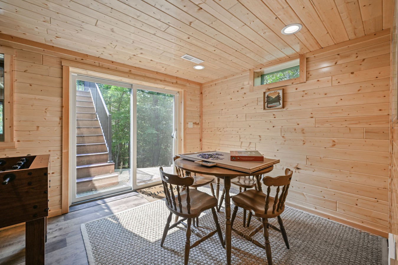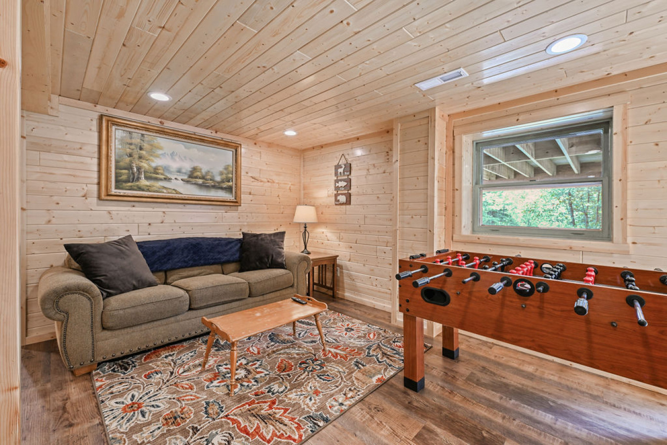 • Basement Lounge: A walk-out lower level area furnished with a sofa, smart TV, and a foosball table.